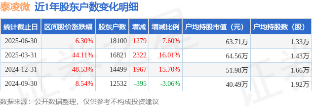 证券之星消息,近日泰凌微披露,截至2025年6月30日公司股东户数为1.81万户,较3月31日增加1279.0户a股杠杆交易平台,增幅为7.6%。户均持股数量由上期的1.43万股减少至1.33万股,户均持股市值为63.71万元。